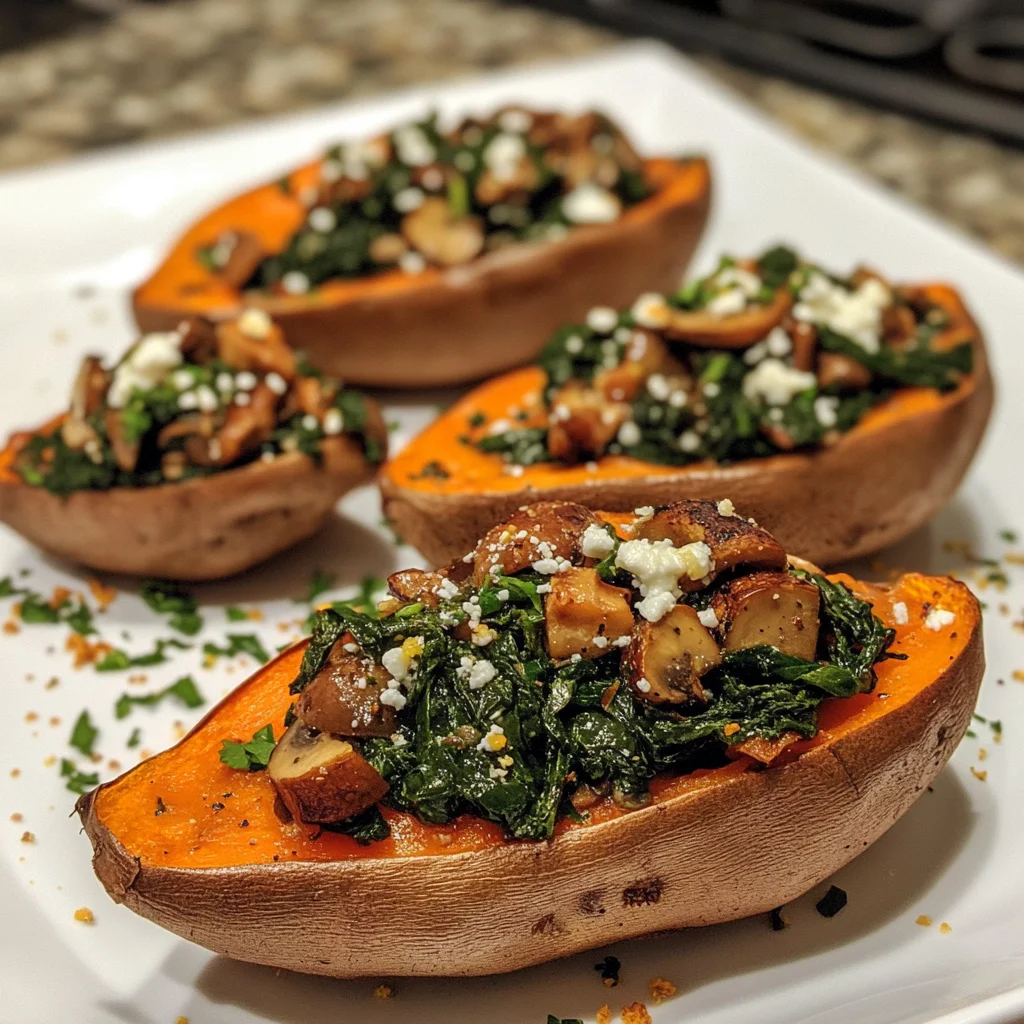 - Spoon the mushroom, spinach, and feta mixture into each sweet potato, filling them generously.
