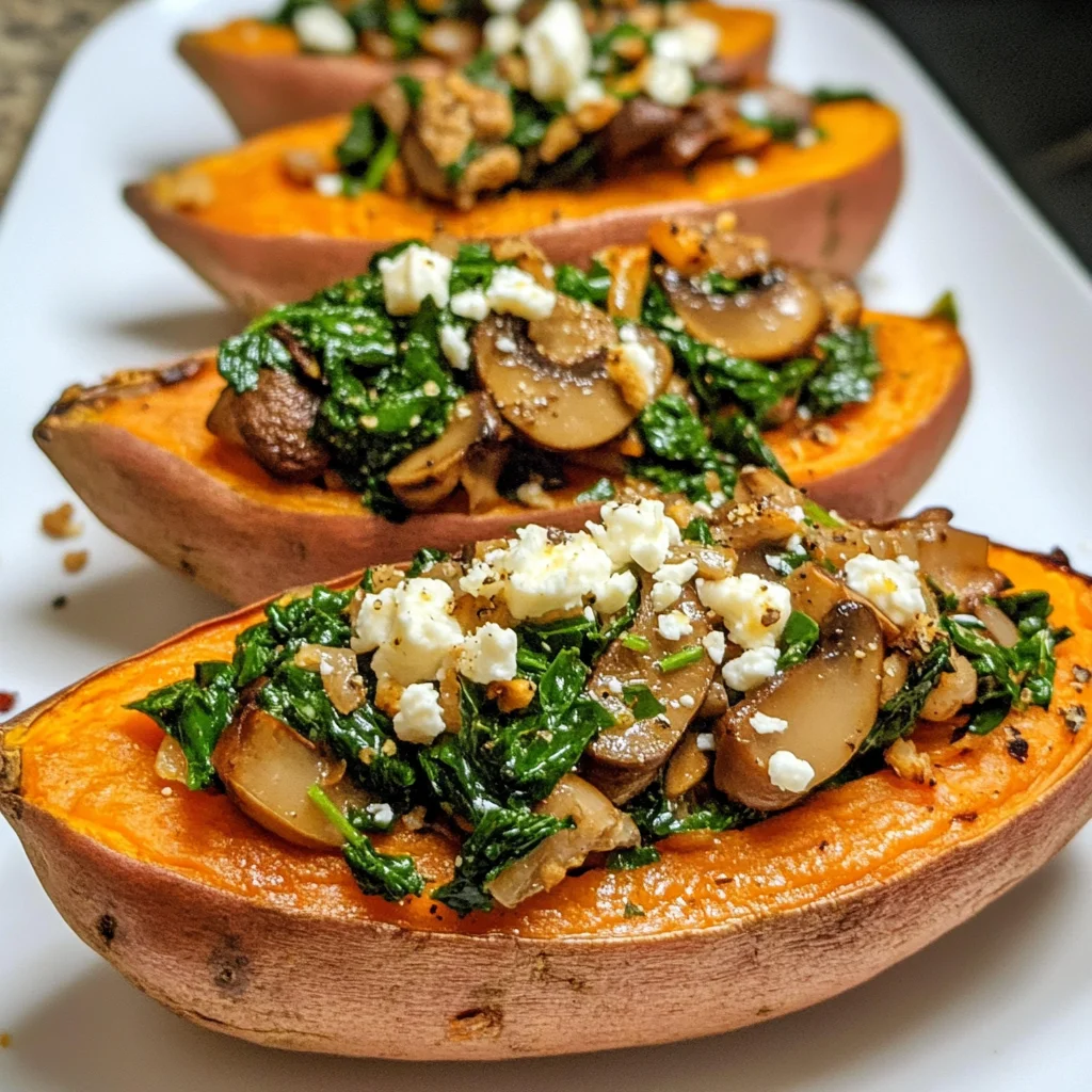 - Spoon the mushroom, spinach, and feta mixture into each sweet potato, filling them generously.