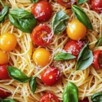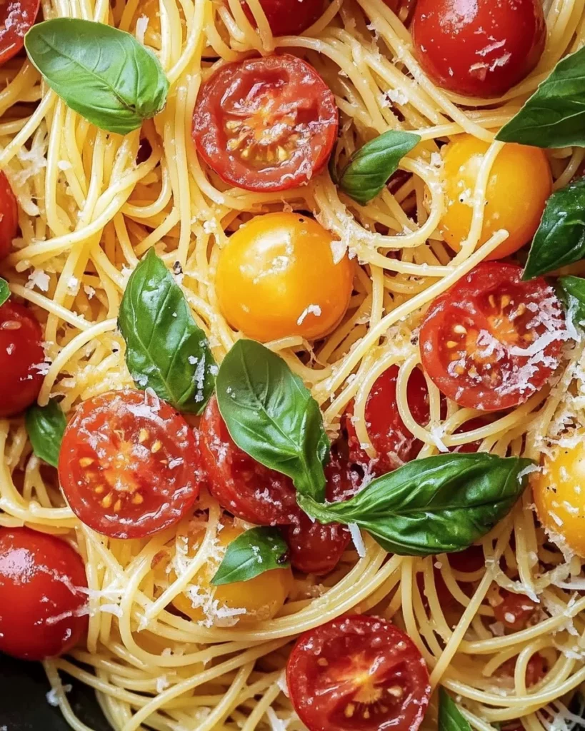A light and refreshing pasta dish featuring fresh cherry tomatoes, basil, and Parmesan cheese, perfect for summer.
