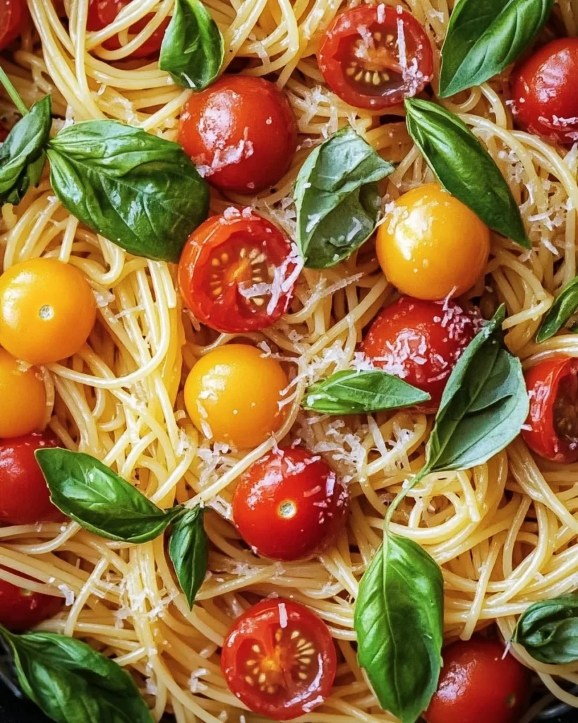 A light and refreshing pasta dish featuring fresh cherry tomatoes, basil, and Parmesan cheese, perfect for summer.