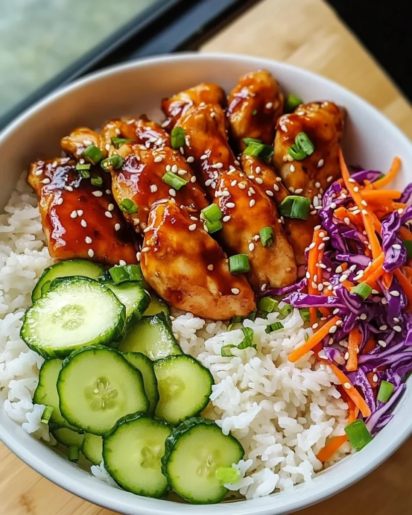 It’s time to bring everything together! In each bowl, start with a generous layer of fluffy jasmine rice. Next, add a portion of the sweet chili chicken, ensuring to drizzle some of that luscious sauce over the top. Then, pile on the sesame slaw for a burst of color and crunch. Finally, top it off with the quick-pickled cucumber slices. For an extra touch, sprinkle some sesame seeds or sliced scallions on top. Your sweet chili chicken rice bowls are now ready to impress!
