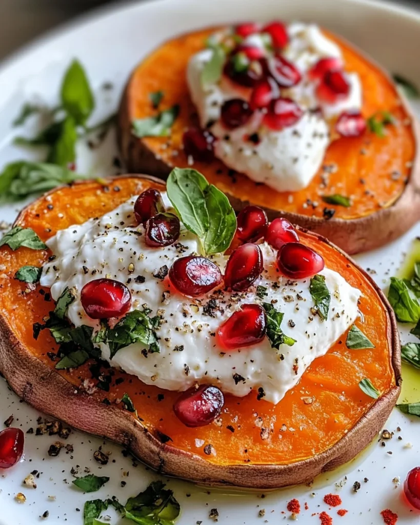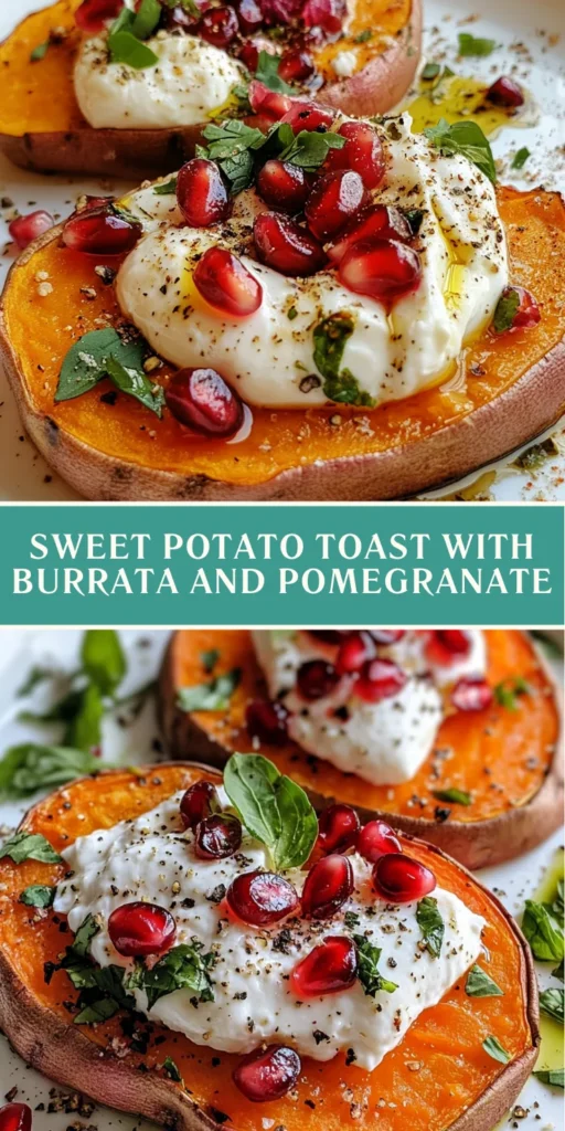 A vibrant and delicious recipe for Sweet Potato Toast topped with creamy burrata cheese and fresh pomegranate seeds, perfect for any occasion.