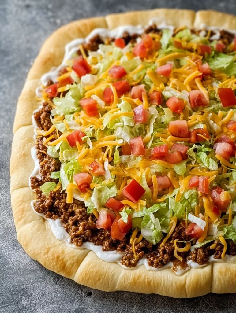 - Spread the seasoned taco meat over the creamy base on the crust. Top with shredded cheddar and mozzarella cheeses, diced tomatoes, and shredded lettuce.