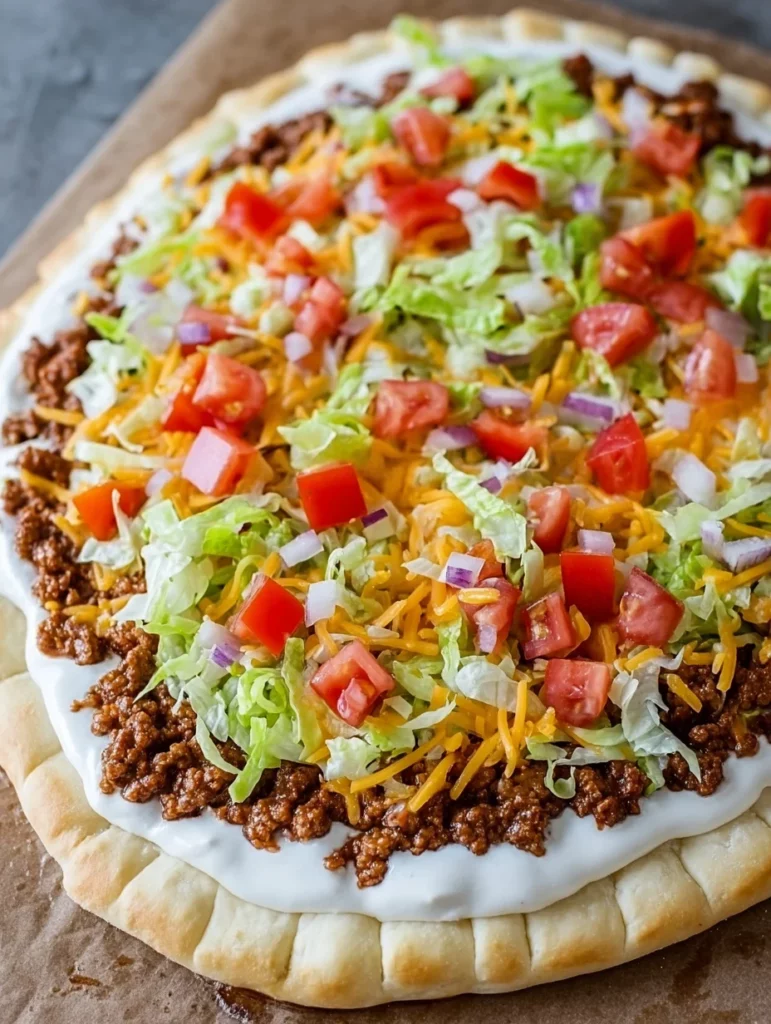Now that your Taco Pizza is layered and beautiful, slice it into eight pieces. Present it on a fun platter or cutting board, and watch everyone’s eyes light up.