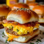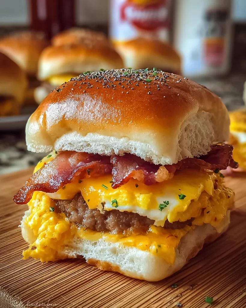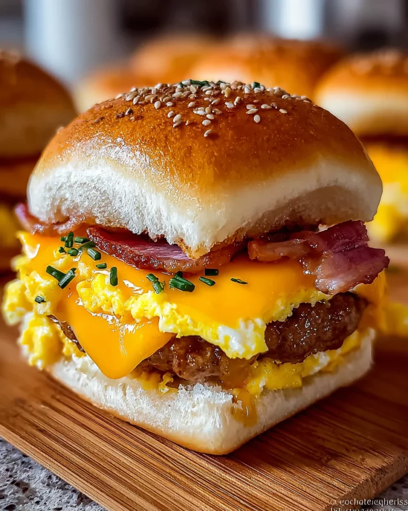 Delicious breakfast sandwiches made with fluffy Hawaiian rolls, filled with a hearty mix of sausage, bacon, eggs, and melted cheese, topped with a flavorful sriracha mayo.