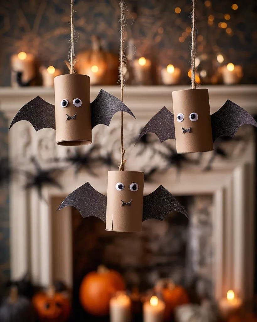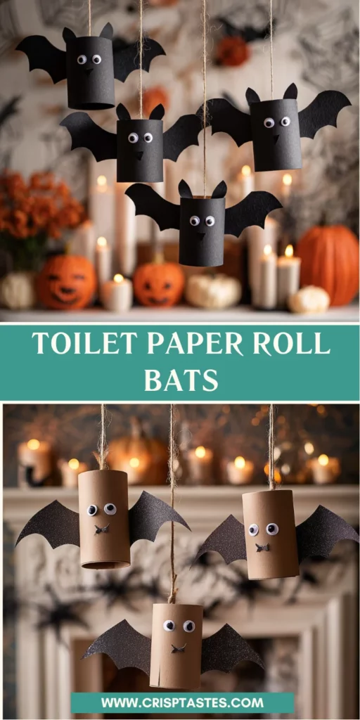 A fun and eco-friendly craft for Halloween using recycled toilet paper rolls to create cute bat decorations.