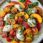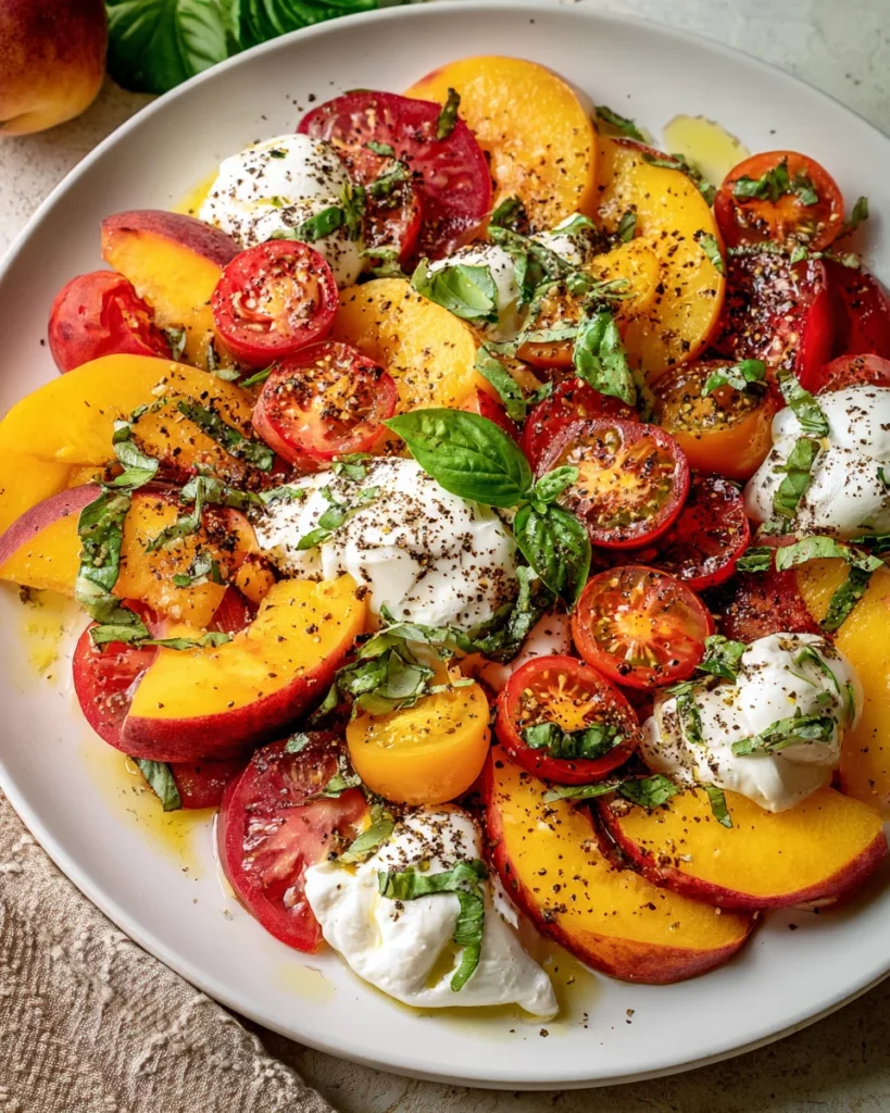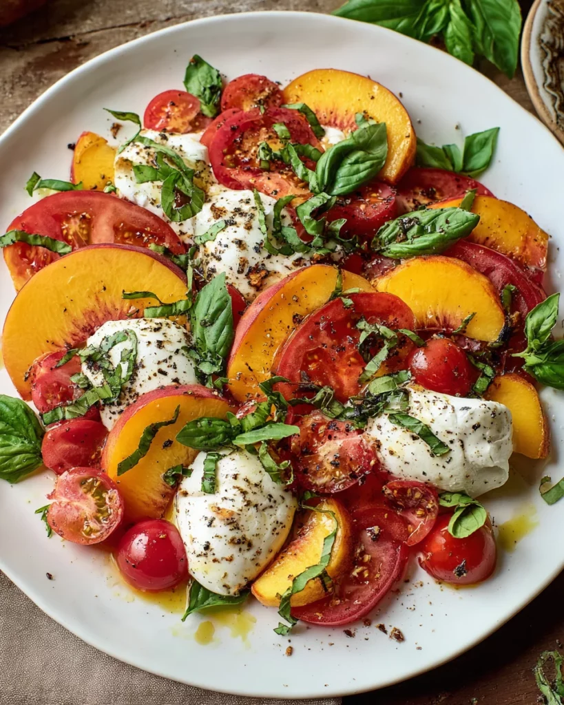 A refreshing summer salad featuring the sweetness of peaches, juicy heirloom tomatoes, and creamy burrata cheese, drizzled with balsamic glaze.