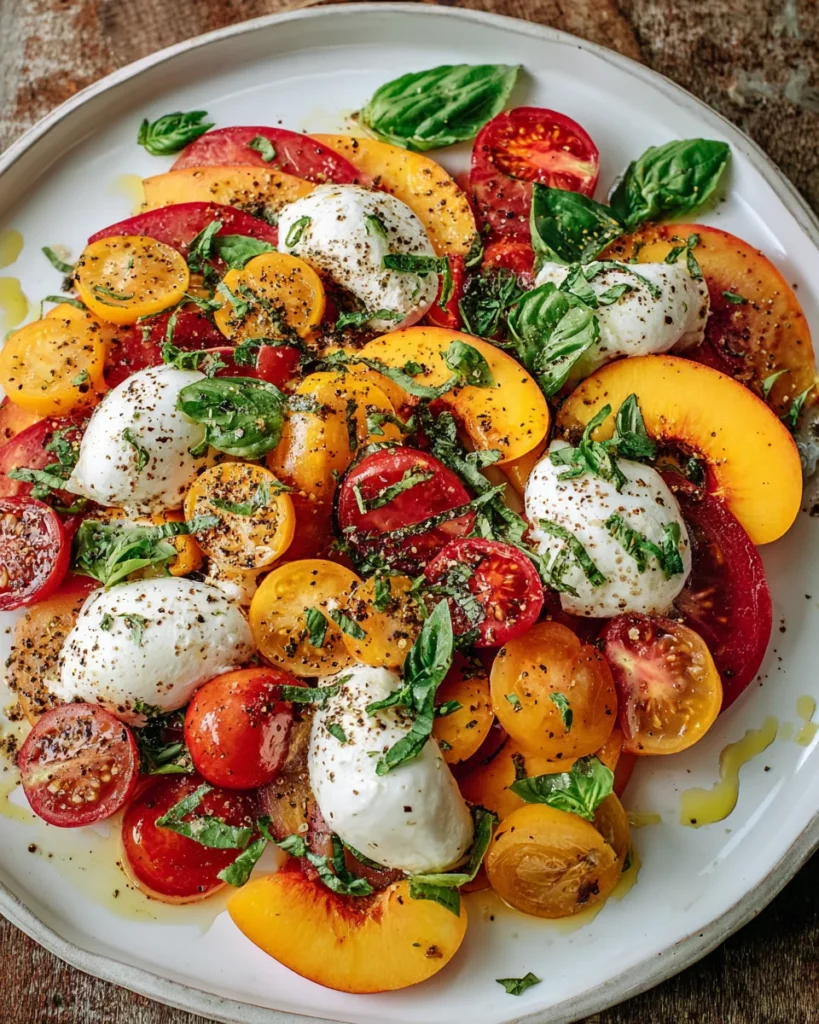 A refreshing summer salad featuring the sweetness of peaches, juicy heirloom tomatoes, and creamy burrata cheese, drizzled with balsamic glaze.