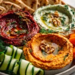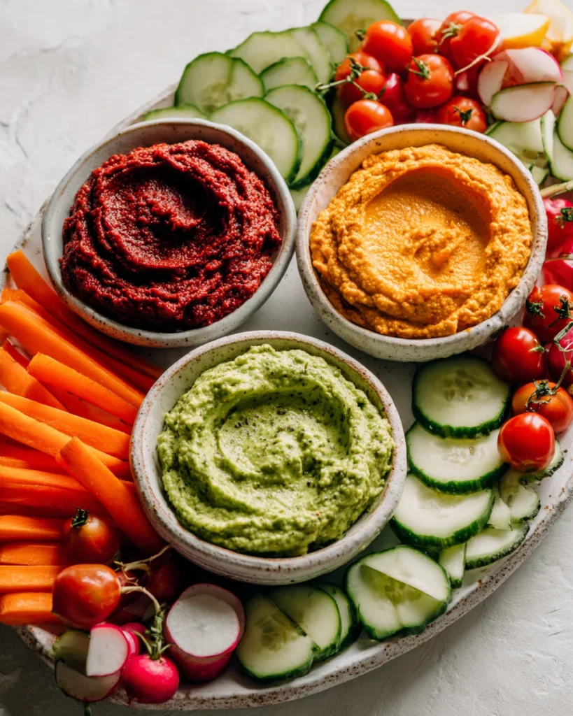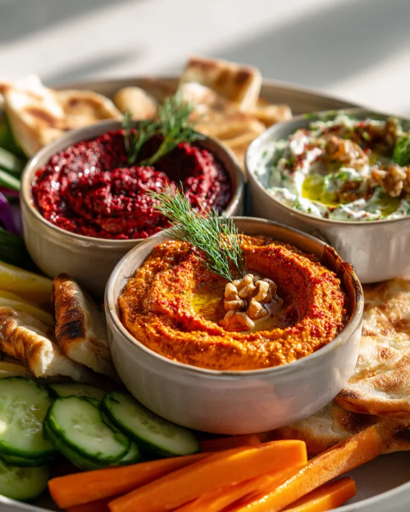 - It’s ideal for sharing at gatherings, as a vibrant starter, or as part of a larger mezze spread. All three dips can be made in advance, making this recipe both practical and time-saving. Served with warm flatbread, crisp raw vegetables, or seeded crackers, it’s an easy yet elevated option that appeals to a wide range of tastes. Whether for a casual picnic, holiday table, or dinner party, this platter delivers on presentation, versatility, and crowd-pleasing flavor.