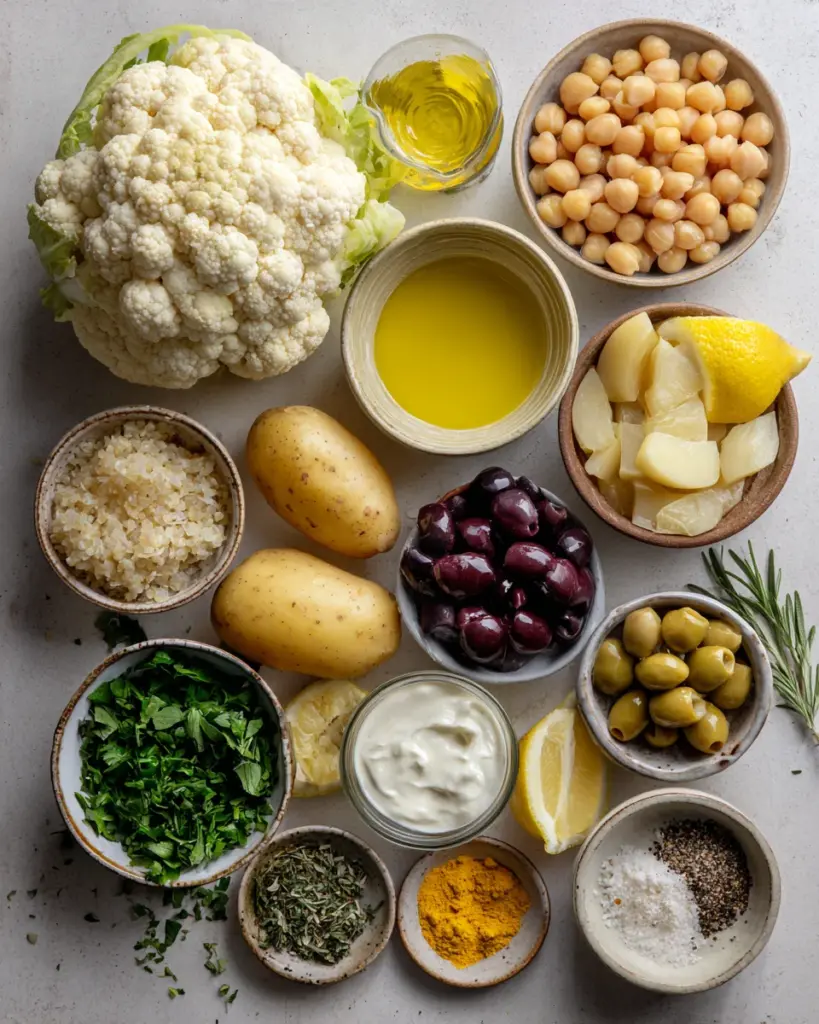 - Cut the cauliflower into florets and slice potatoes into even wedges. Drain and rinse chickpeas thoroughly. Combine cauliflower, potatoes, chickpeas, and pitted olives on a large baking sheet.