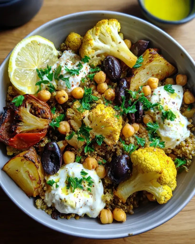 - Sprinkle chopped parsley and additional lemon juice over the roasted vegetables. Gently fold in the cooked quinoa or preferred grain. Serve in bowls with Greek yogurt and extra lemon to taste.