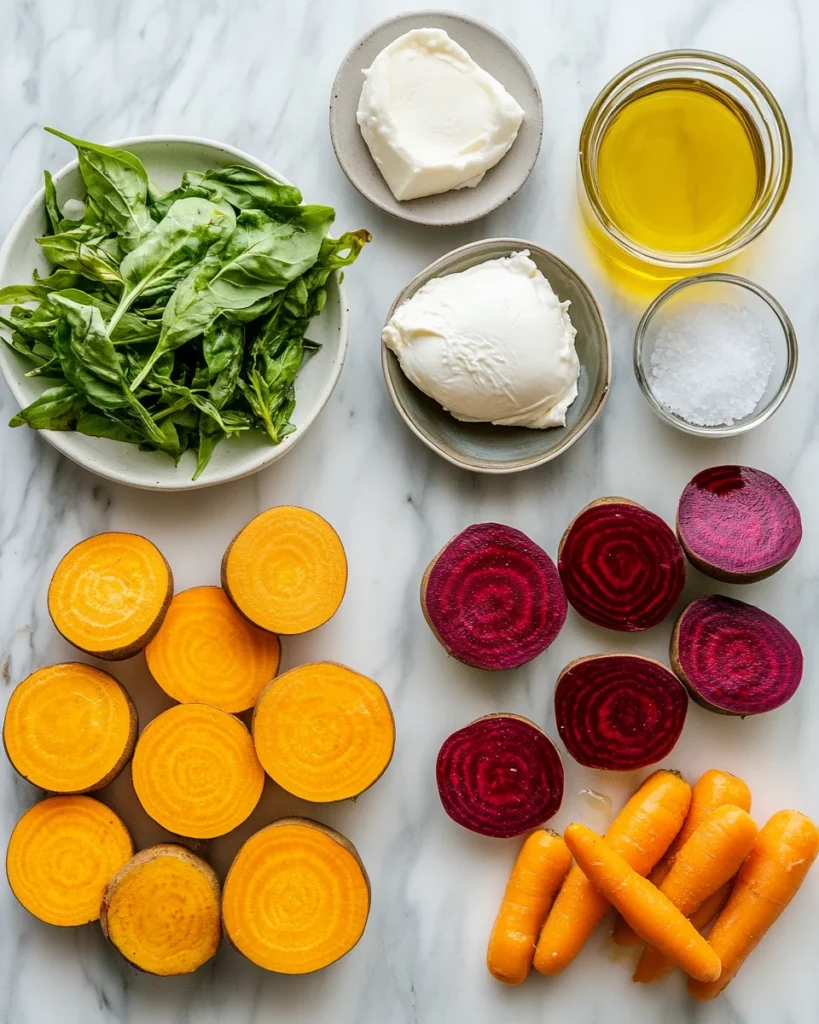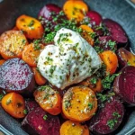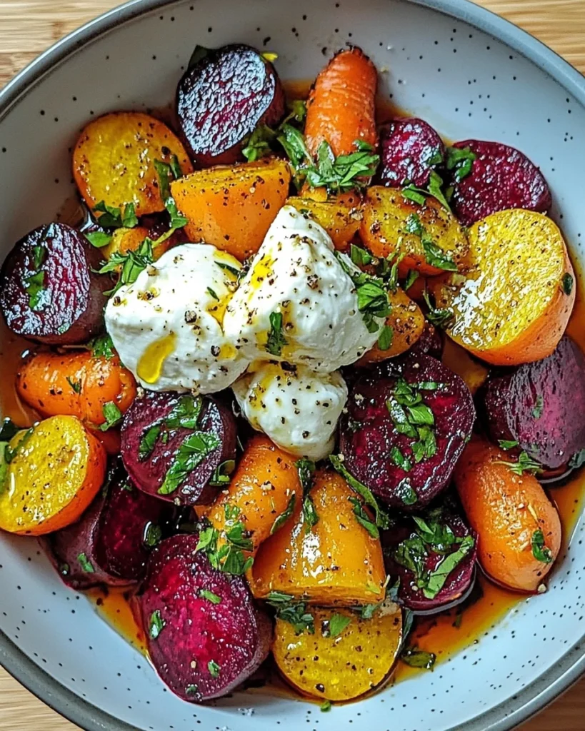 This Vibrant Roasted Beets & Carrots with Burrata Salad is a celebration of color, texture, and bold yet balanced flavors. Roasted golden and red beets paired with tender carrots create a naturally sweet, earthy base. Wilted beet greens add depth, while creamy burrata and a tangy rosemary-honey vinaigrette tie it all together in one showstopping salad. Whether served warm or at room temperature, this dish is as nourishing as it is beautiful—perfect as a vegetarian main or stunning side.