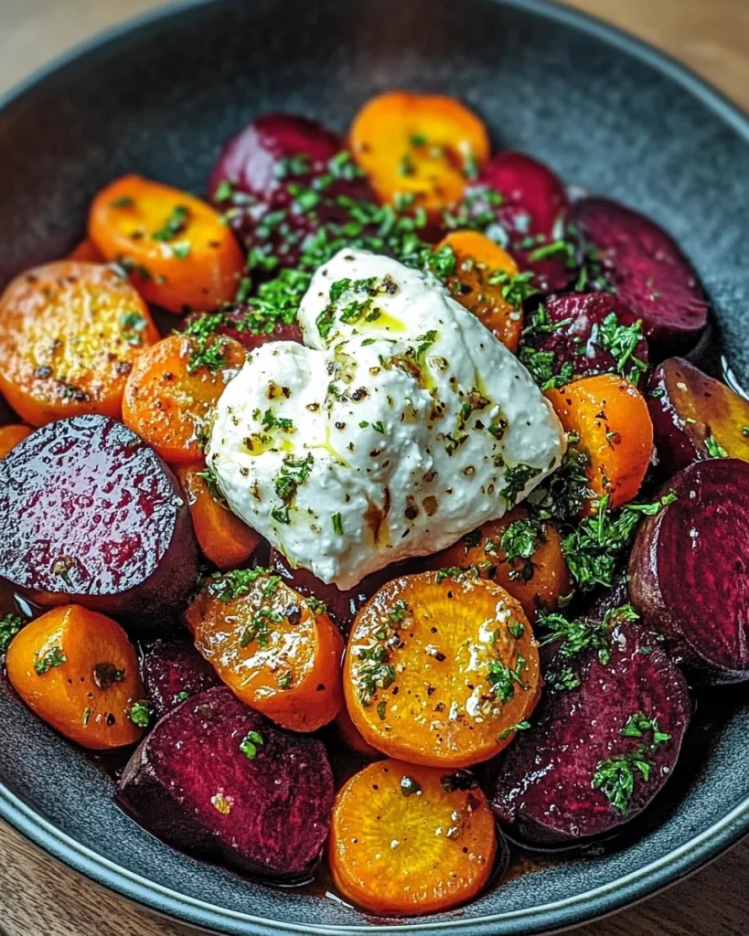 This Vibrant Roasted Beets & Carrots with Burrata Salad is a celebration of color, texture, and bold yet balanced flavors. Roasted golden and red beets paired with tender carrots create a naturally sweet, earthy base. Wilted beet greens add depth, while creamy burrata and a tangy rosemary-honey vinaigrette tie it all together in one showstopping salad. Whether served warm or at room temperature, this dish is as nourishing as it is beautiful—perfect as a vegetarian main or stunning side.