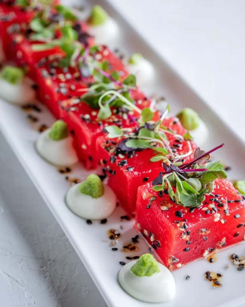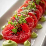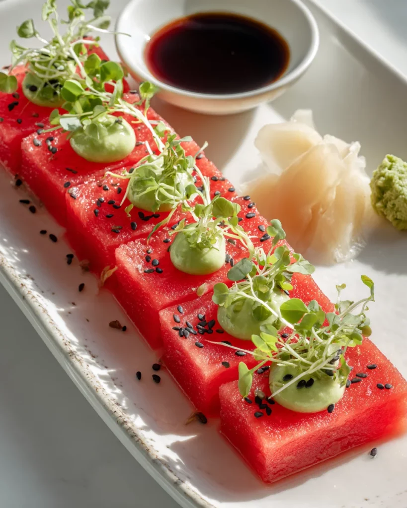Fresh, vibrant, and no-cook—this vegan watermelon sashimi features marinated watermelon slices and a smooth avocado-wasabi cream for a bold, elegant bite.