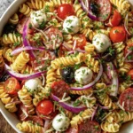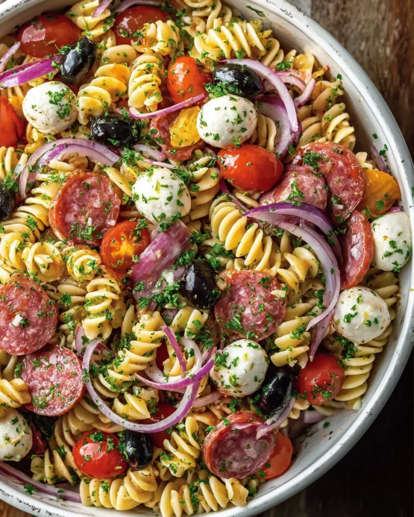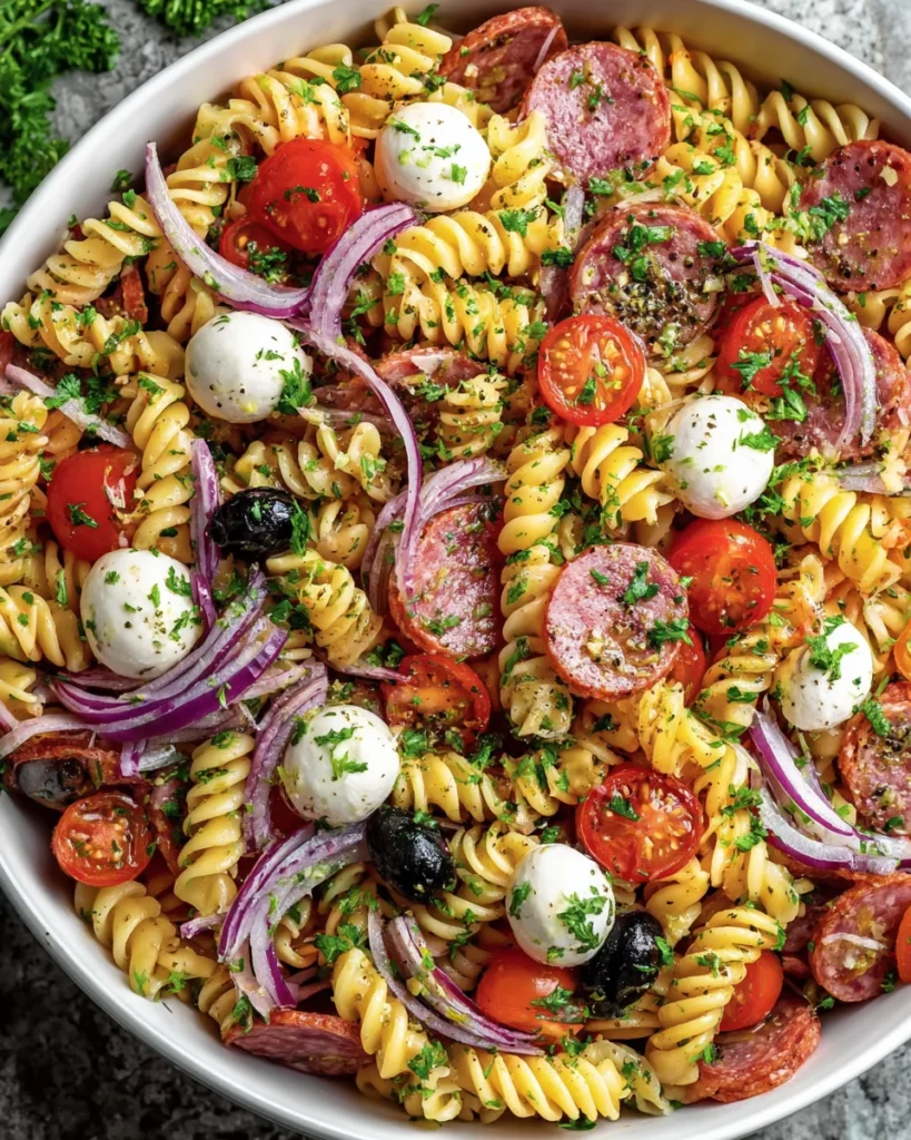 A refreshing and savory Zesty Italian Salad featuring rotini pasta, a medley of cheeses, cured meats, and vibrant vegetables, enhanced with a homemade dressing.